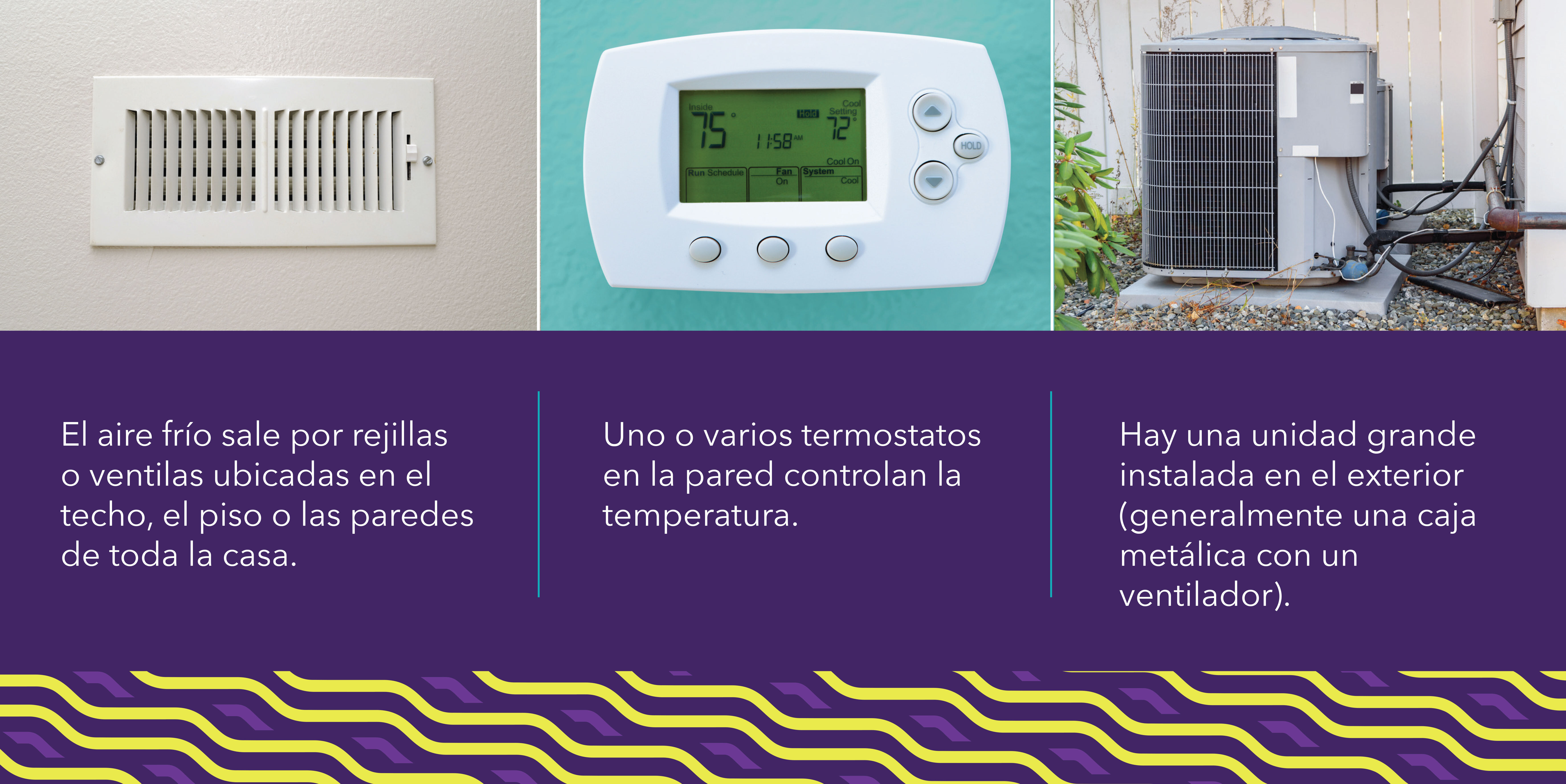 El aire acondicionado central distribuye aire frío por toda la casa mediante rejillas o ventilas en techos o paredes. Busque un termostato en la pared que controle calefacción y aire acondicionado, con opciones como “cool,” “heat” y “fan,” además de una unidad exterior. También puede consultar nuestra guía guía para identificar el tipo de sistema que tiene.