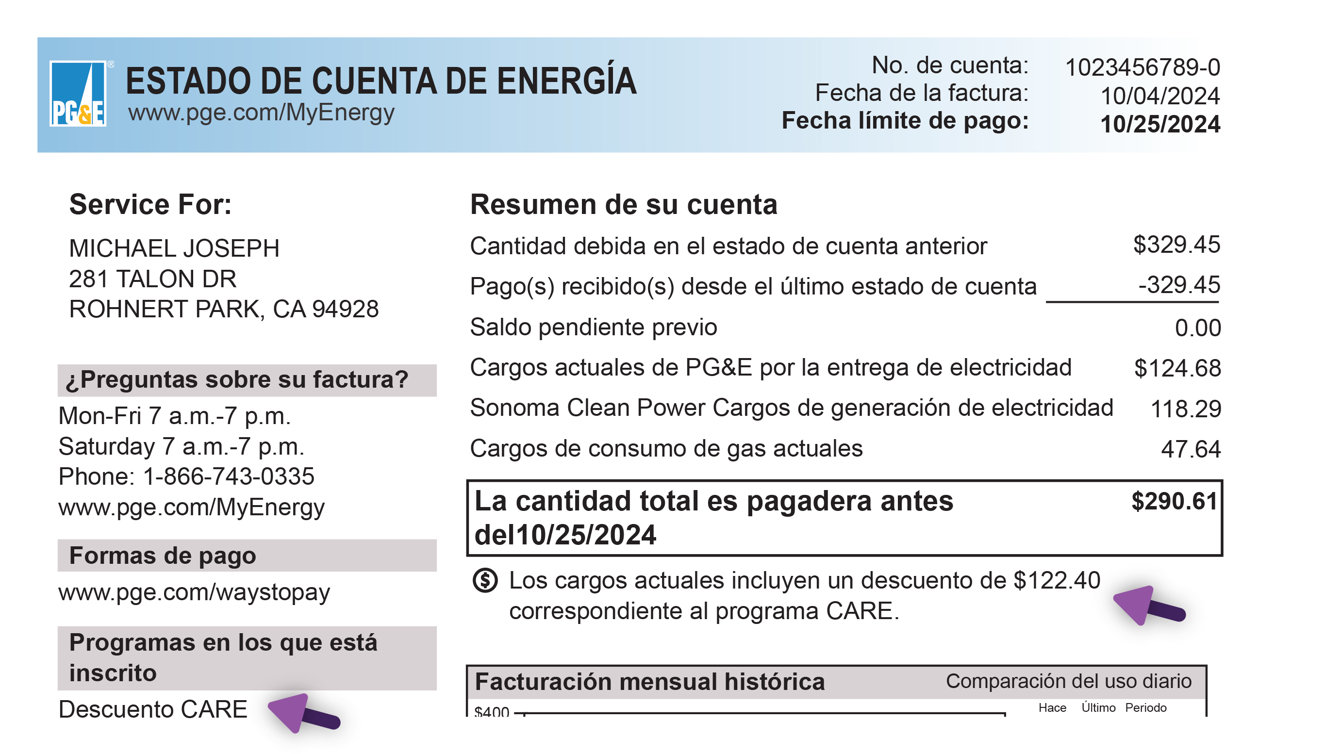 California Alternate Rates for Energy (CARE) y Family Electric Rate Assistance (FERA) son programas que ofrecen descuentos en la factura eléctrica según el ingreso del hogar. Este programa está dirigido específicamente a clientes inscritos en CARE y FERA. Para más información o para verificar su elegibilidad, visite el sitio web de PG&E.